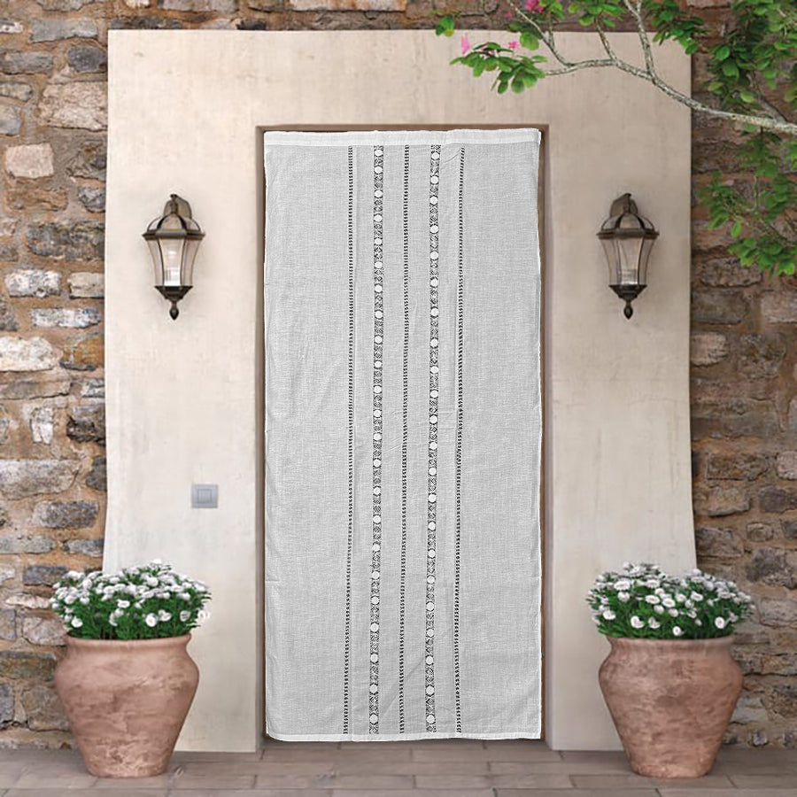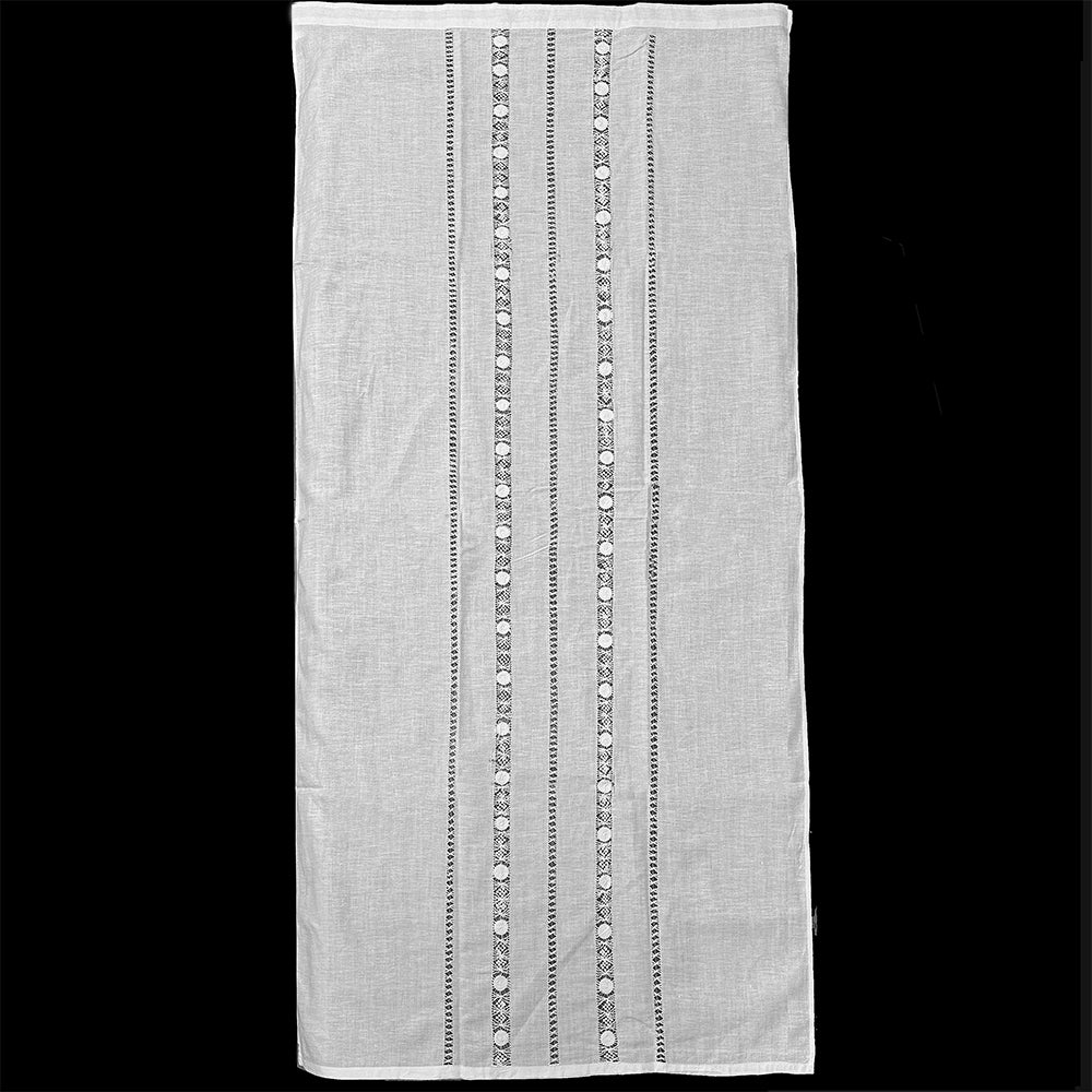 Cortina de hilo y algodón con con vainicas anchas tipo “frailes amarrados” bordadas, terminación recta.